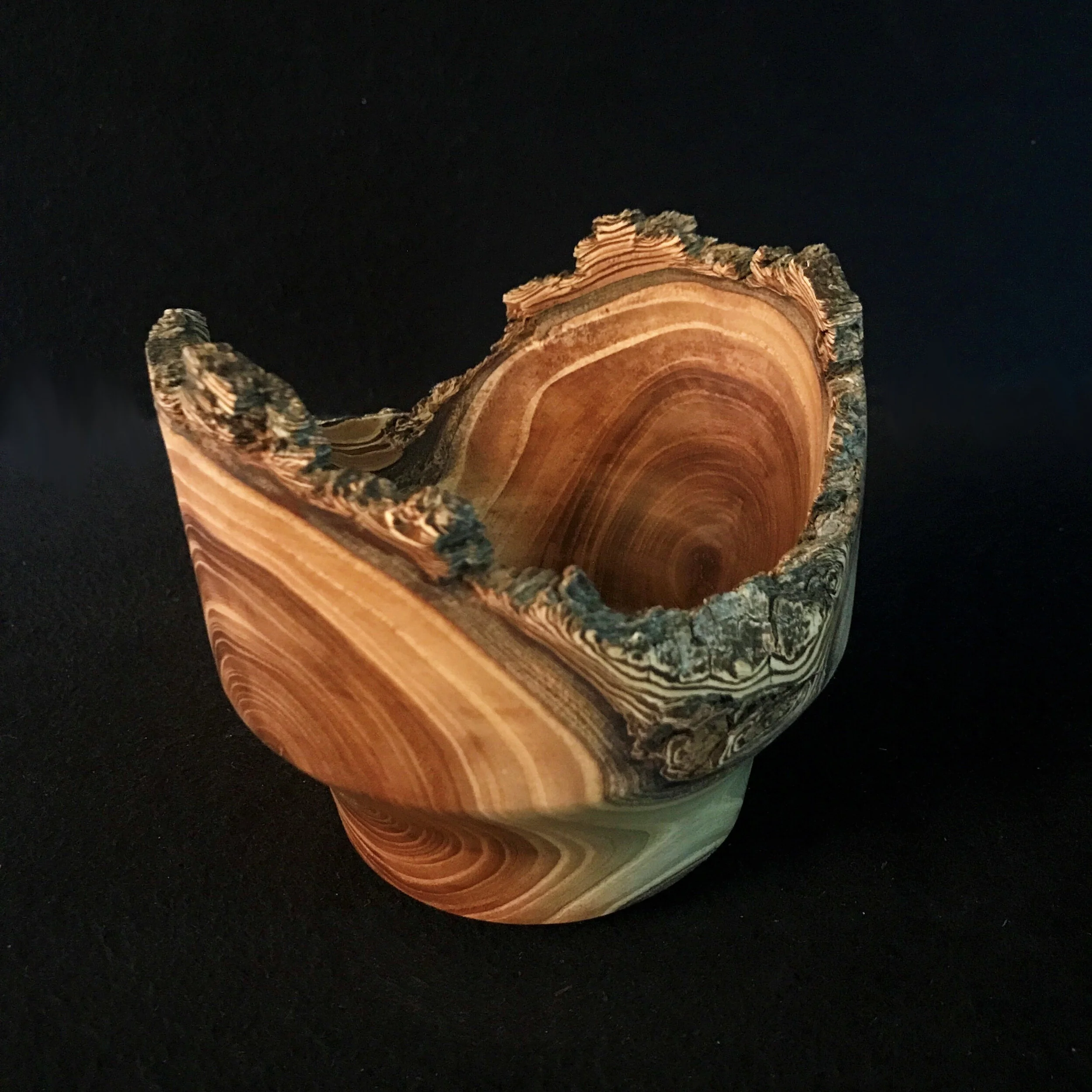 “My vases are handcrafted from downfall, distressed, or bug-killed trees found in the Lincoln area, primarily Rocky Mountain Juniper, Quaking Aspen, and different species of pine. The natural decaying process produces the expressive coloration in these vases. The insect trails, stress cracks, bark inclusions, and knots add character to the vases (sorta like life). Shaping and hollowing distressed and decaying wood is a challenge due to the fragility of the wood.