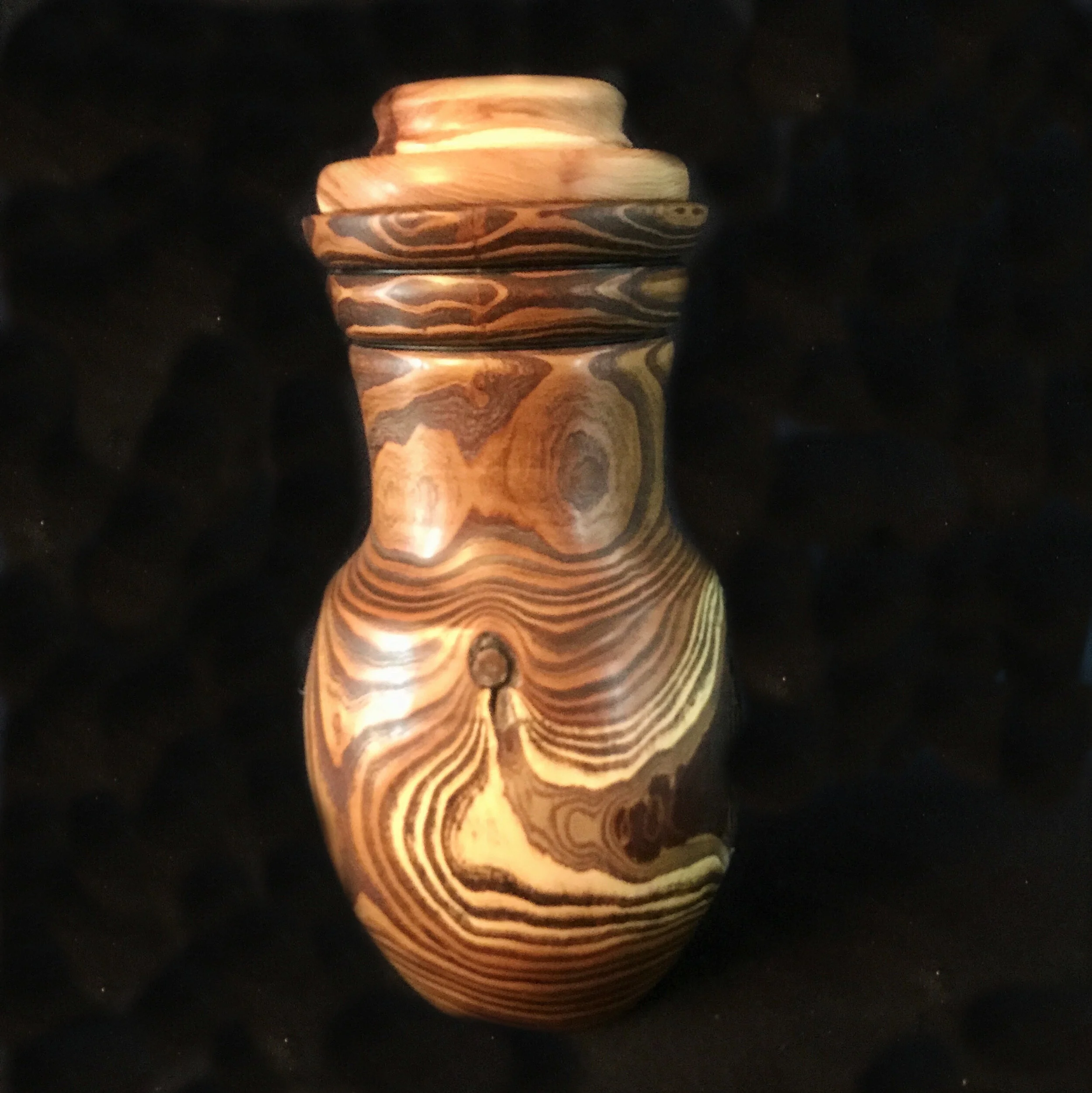 For the base or rim, I sometimes use exotic woods such as redheart, purpleheart, hickory, walnut, bubinga, etc. I sometimes use these exotics in segmented vases where strips of wood are glued together, then turned and shaped, and then hollowed. When the wood grain yields an open face, I like to wood burn and/or paint something, as long as it contributes to the overall scheme of the vase. Sometimes a colored mineral inlay such as turquoise is appropriate for some irregular stress cracks. With distressed wood, no two vases are alike, each is a one-off vase. My vases are not intended to hold water, which is contrary to the idea of a vessel, but these are for décor use only. Some vases lend themselves to artificial flowers or dried grasses.”
