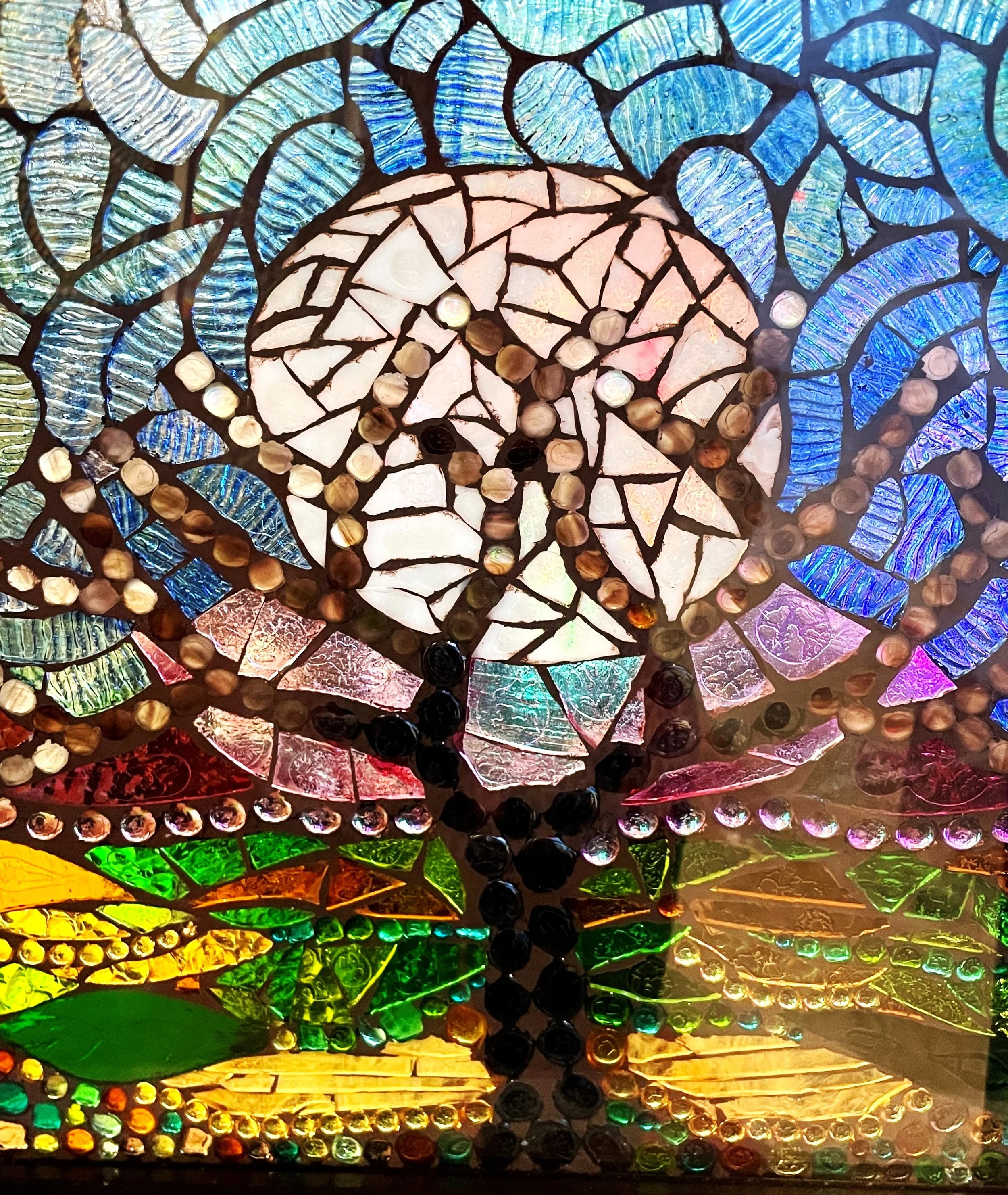 In keeping with her desire to gather and conserve Jenn mostly uses recycled and resourced materials. The backings are old industrial carpet squares, refurbished cabinet doors, and old frames and mirrors. Using “scrap glass” (the leftovers from glass artists and broken things) for her mosaic work.