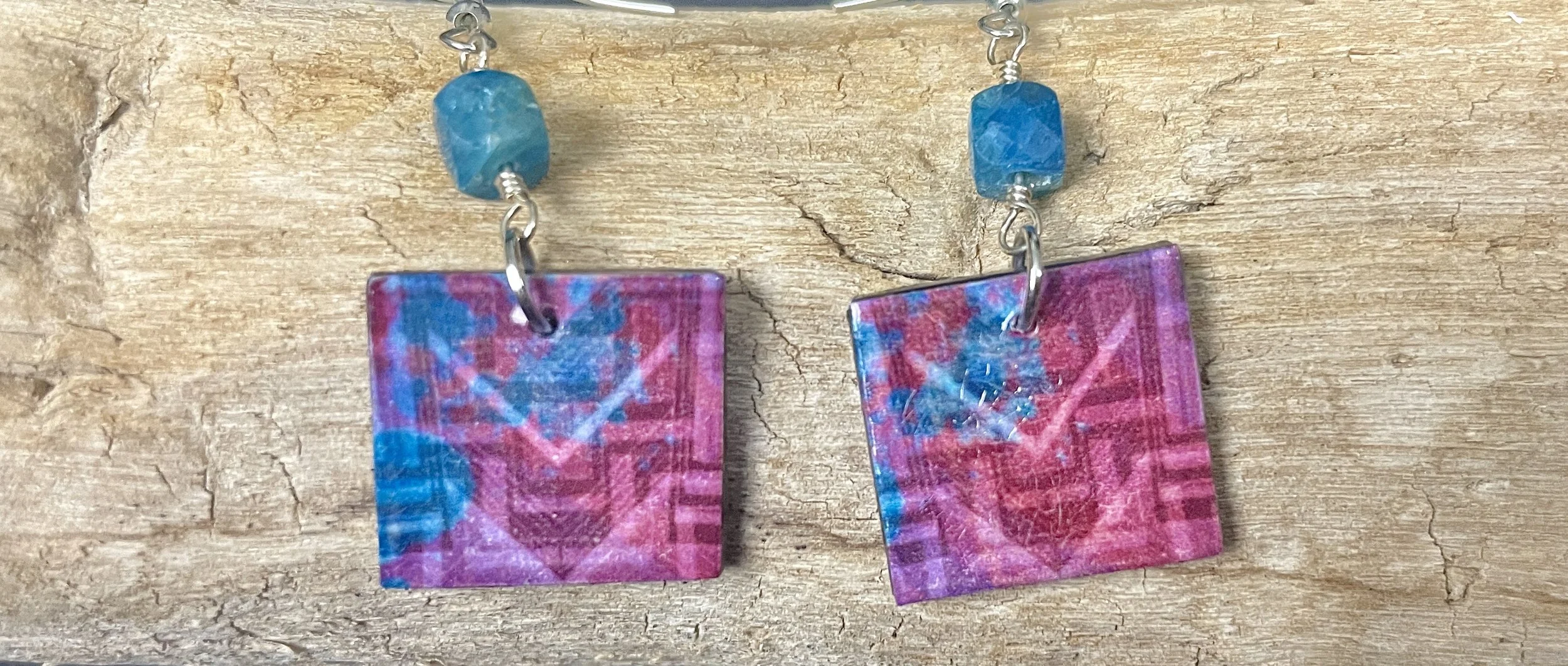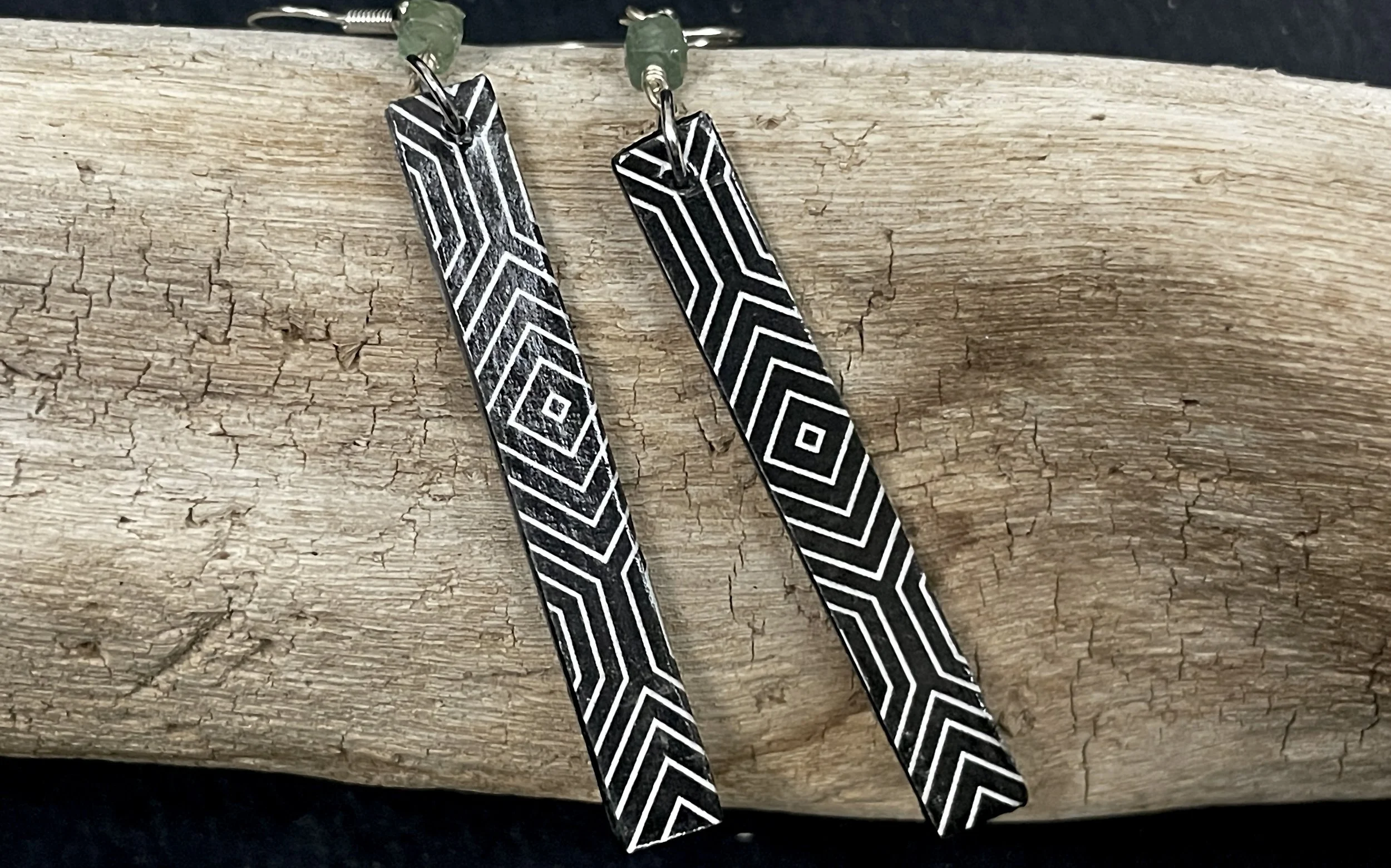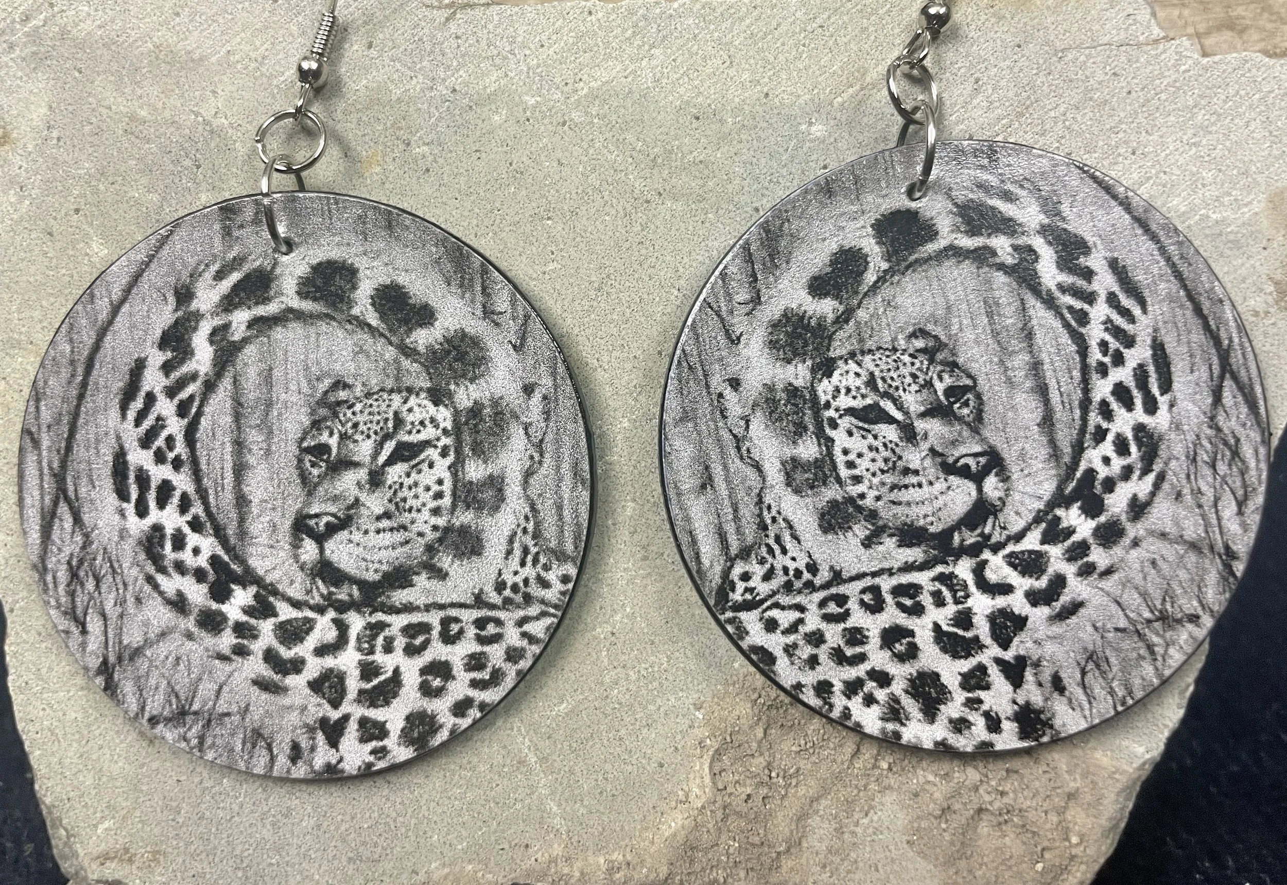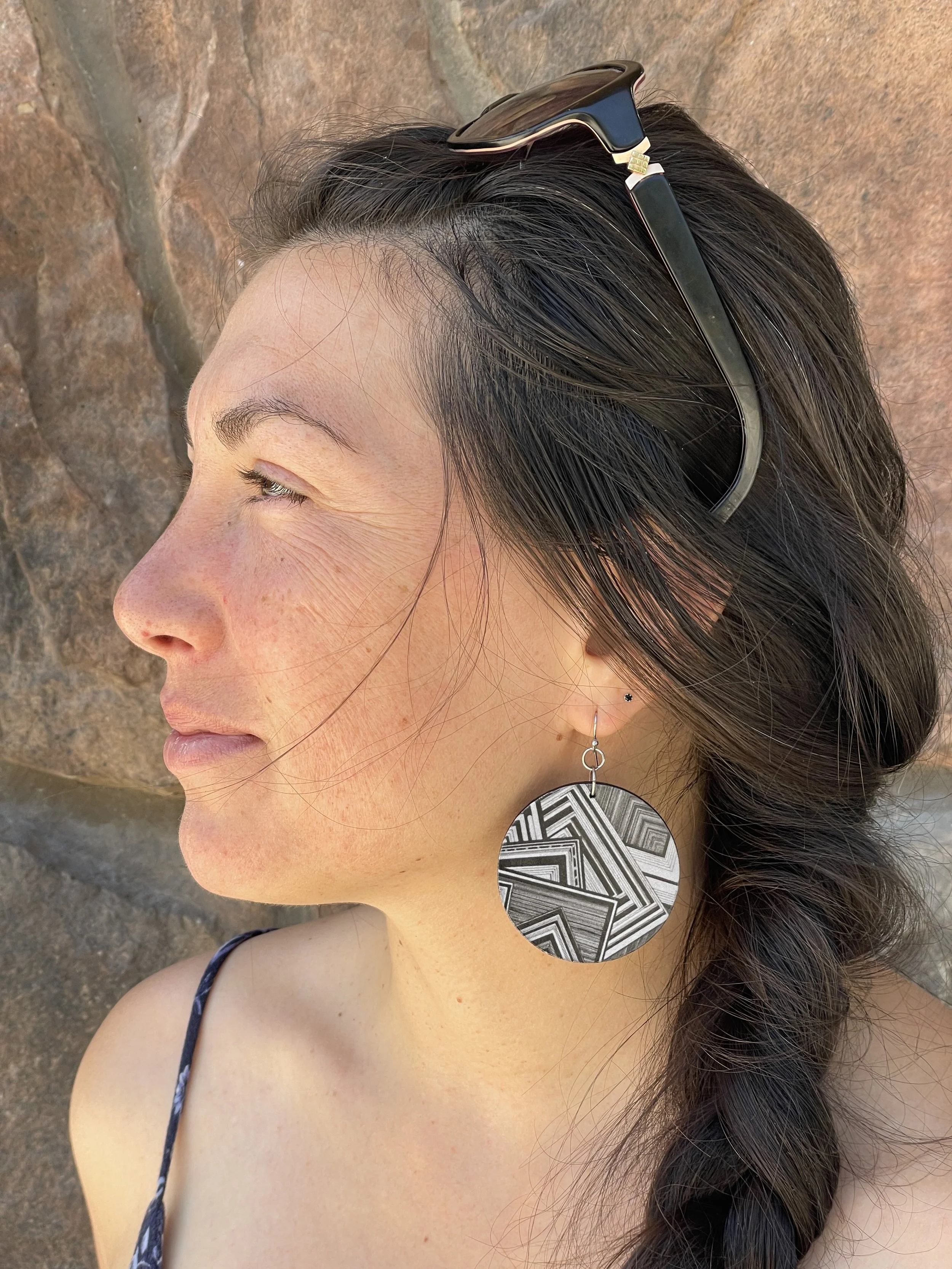“Mariah uses mainly pen and charcoal to draw animals and geometric patterns. The collection of earrings all feature different size prints of her original artwork.